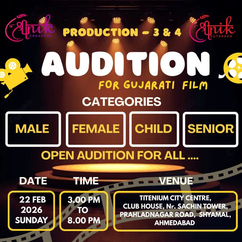 અમદાવાદ: ગુજરાતી ફિલ્મ ઉદ્યોગમાં નવીનતા અને ગુણવત્તાસભર ફિલ્મો આપવા માટે જાણીતા શ્રીનિક પ્રોડક્શન દ્વારા તેમના પ્રોજેક્ટ નંબર 3 અને 4 માટે ભવ્ય ઓપન ઓડિશનની જાહેરાત કરવામાં આવી છે. આ ઓડિશન આગામી રવિવાર, 22 ફેબ્રુઆરી 2026 ના રોજ અમદાવાદના પ્રહલાદનગર વિસ્તારમાં યોજાશે. આ ઓડિશન Male, Female, Child અને Senior કેટેગરી માટે ખુલ્લું રાખવામાં આવ્યું છે.